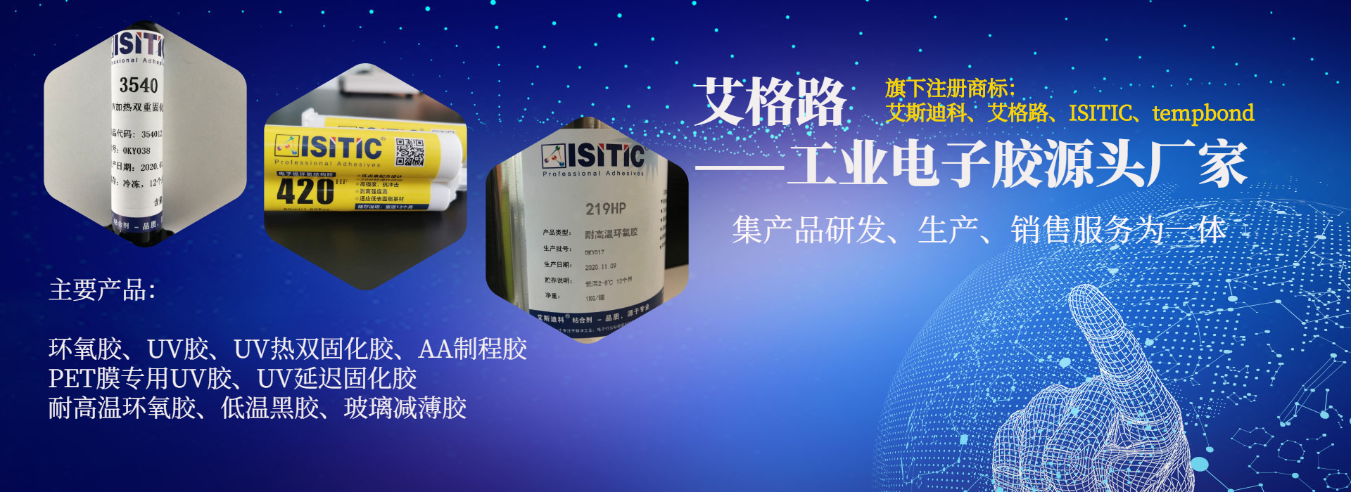 為客戶提供環(huán)氧膠、UV膠、臨時粘接膠、UV加熱雙固化膠、丙烯酸結構膠等工業電子用膠解決方案